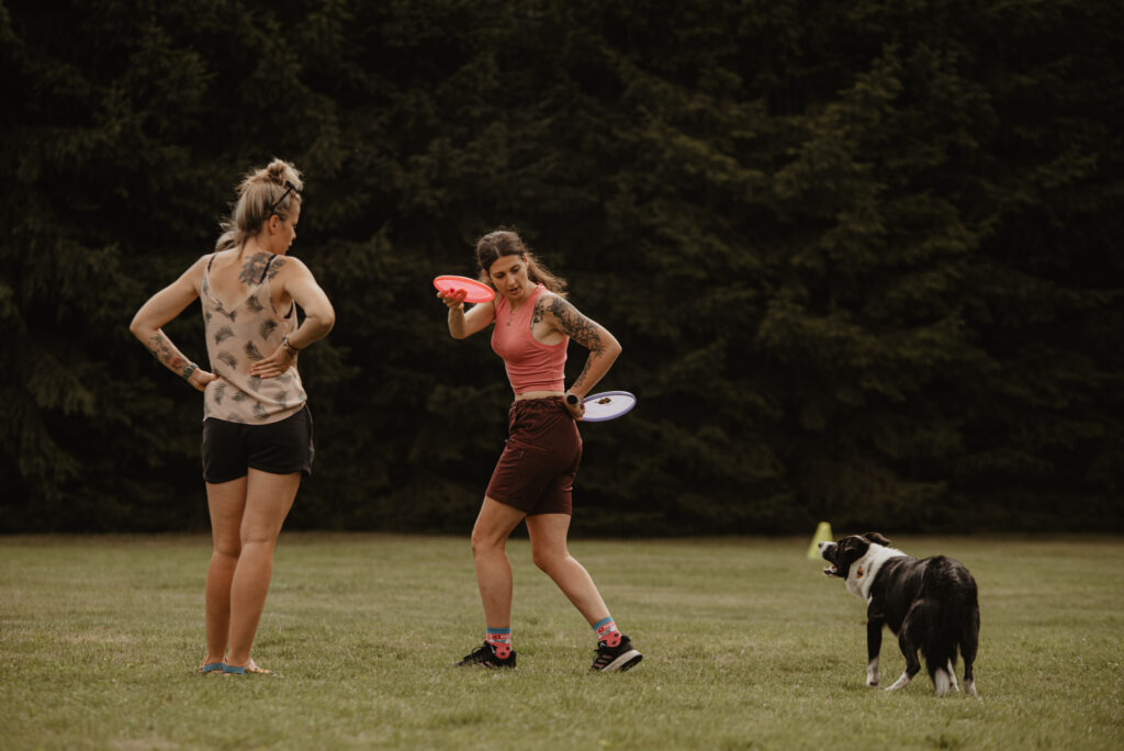 Har din hund svårt att vänta lugnt så är du välkommen att ta med dig en person som kan ta hand om din hund och gå runt med den när du själv kastar frisbee.